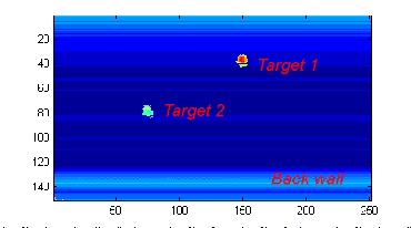 Ultrasonic image of the interior of concrete. Test surface was the top of the image. The back-wall has been detected at approximately 140 cm (bottom of image) along with two stressing tendon ducts - marked Target 1 and Target 2. (Image created by the Institut für Massivbau, Darmstadt using methods recommended by Cambridge Ultrasonics).
