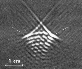 Experimental photograph of ultrasonic waves (1.5 MHz) focussed to a caustic (dotted white lines).