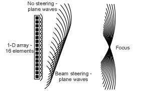 Above - a 1-D phased array of 16 elements produces circular wavefronts that combine to create: plane waves (close to the array), steered plane waves (intermediate) and a focus (right-most).