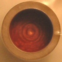 Above - photograph of a biological liquid with cylindrical ultrasonic standing waves in it. Red cells are collecting in ring patterns at the nodes of the standing waves.
