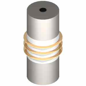 Sketch showing a Langevin transducer, commonly used in high power ultrasound systems. The device has a resonance at a thickness mode along its cylindrical axis. Four white ceramic piezoelectric discs are held in the centre under compression by a high tensile steel bolt (black) running through the centre of the Langevin device. Beryllium/copper shim is used between the piezoelectric discs for making electrical connections. At resonance the flat end faces are anti-nodes making the cyclinder a half-wavelength long. The device is designed to have a high mechanical quality factor, Q. The piezoelectric discs pump energy into the resonator at the frequency of resonance and in the absence of any loss of energy the amplitude becomes larger and larger. In use the Langevin transducer is generally coupled to a waveguide that will convey the mechanical energy to a point where it is used and this is the main energy loss mechanism - the load. The waveguide is commonly a resonator and tuned to the same frequency as the Langevin transducer.