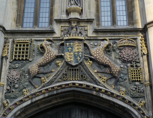 If you have an interest in heraldry then you will like Cambridge. This is the (huge) crest over the top of the main gate into Christ's College. Similar crests can be found over the gatehouses of most of the colleges but see St John's College and Trinity College.