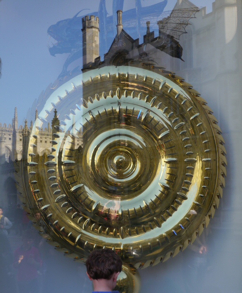 Corpus Christi College clock - corner of King's Parade and Benet Street. New, modern design with flashing lights and a mechanical insect crawling over the top. Watch you don't get injured by a cyclist if you step out into the street to take a photograph of this monster.