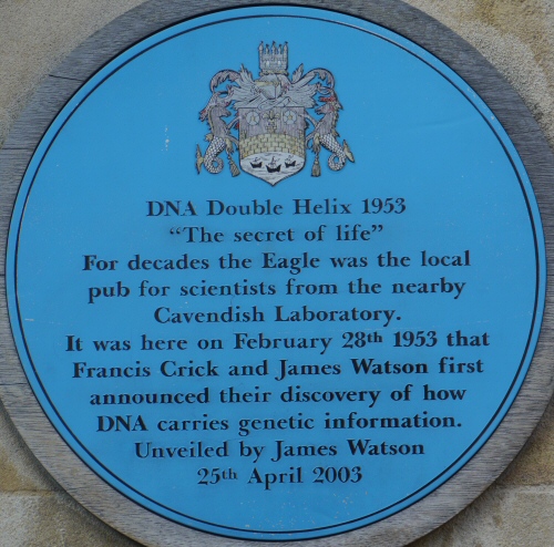 A plaque on the wall of the Eagle pub. One of the few to show where great Cambridge thinkers worked.